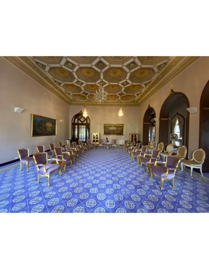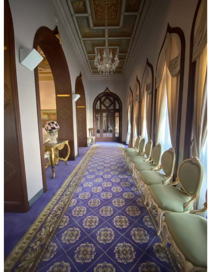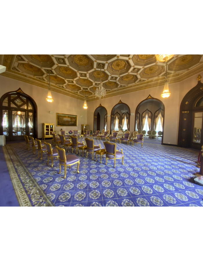 The building has two floors with a neo-Venetian Gothic architecture combined with Byzantine art and one staircase. On the roof there is a small shrine to Phra Phrom. Downstairs are three lounges. The first is the Golden Dome Room on the south side of the building for the prime minister's guests. The second is the Ivory Room which is in front of the Golden Dome Room and adjacent to the right, which is a lounge for official visitors of the prime minister. The third is the Purple Room, which is on the ground floor to the right-hand side of the building. This is a lounge for the visitors of the deputy prime minister and other cabinet ministers. The building has a small conference room for the Board of Committees, chaired by the prime minister. The upper floor of the building houses the prime minister's office, the offices of political officers, and the old cabinet conference room.